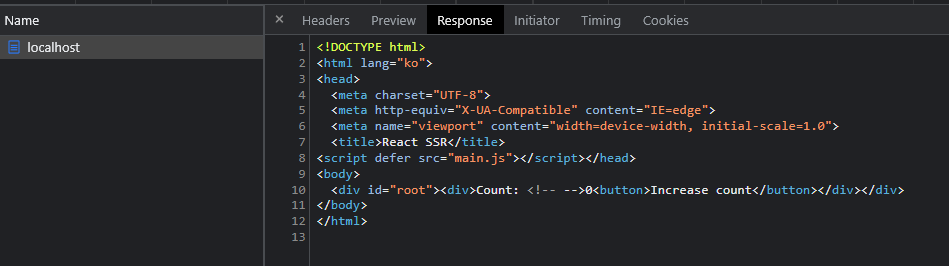 바로 <div id="root"></div> 안의 내용이 채워져 있는 상태로 왔다는 점인데요! SSR 구현에 성공했다고 볼 수 있습니다.